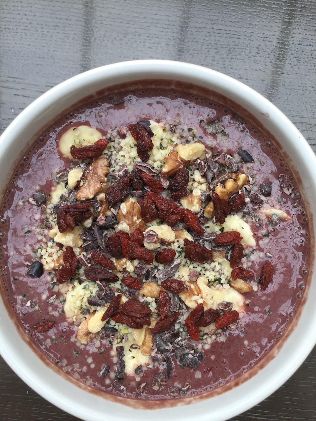 A vibrant superfood açaí bowl topped with crunchy nut-and-seed granola, goji berries, and hemp hearts. Gluten-free, nutrient-dense, and naturally energizing—this clean, performance-driven bowl delivers antioxidants, healthy fats, and satisfying texture in every bite.